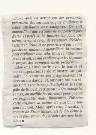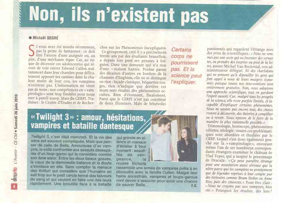 L'Avenir de ce samedi 26 juin 2010 sortait dans son supplément "cinéma" un article plein de mordant sur Twilight, la fameuse saga qui met en scène des vampires des temps modernes. Derrière cet article sans prétentions se cachait, une fois de plus, une interview de M. Vanbockestal, réalisée par le journaliste Michaël Degré. Bien que, aujourd'hui encore, cet article soit disponible sur le site du journal: http://www.lavenir.net/article/detail.aspx?articleid=8884267 en voici le texte au format papier, avec nos commentaires.