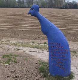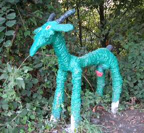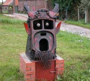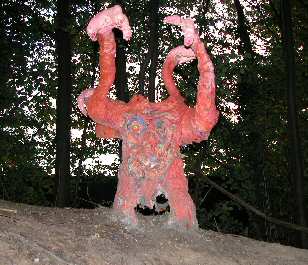 Toujours dans le domaine du béton, vous trouverez aussi une sorcière bleue (?) et à l'oeil rouge qui vous indique la direction à suivre tout en rappelant l'incantation magique. Vous ne manquerez pas "El Mahomeu" (le Mahomet) qui est en fait aussi un épouvantail très spécial. Parfois aussi, vous passerez par des endroits où vous ne trouverez... rien ! C'est qu'il y avait jadis là des têtes de bonshommes en béton, à proximité d'un ruisseau, mais que des vandales les ont saccagés, en ont jeté les poteaux dans le ruisseau, laissant là aussi la trace indélébile d'un des laids débiles qui hantent notre société. On ne refera plus le monde, hélas!