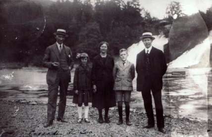 Cette photo, qui ne date manifestement pas d'hier, n'a comme seul rapport avec notre objet que d'avoir été pris au pied de la même cascade. Il s'agit d'une photo de famille que nous ne connaissons pas, la photo est issue du Net, d'un site qui ne traite absolument pas de paranormal. À première vue, à part qu'il s'agisse d'une photo noir et blanc en argentique, il n'y a rien de spécial, en effet. Mais en regardant plus attentivement, on remarque sur la droite une silhouette pour le moins fantomatique. À gauche de la photo, dans le coin supérieur, on distingue ce qui pourrait bien être un orbe. À coup sûr, en tous cas, il y a là un "truc" circulaire, qui - de plus - semble présenter des inclusions. Mais ce n'est pas tout.