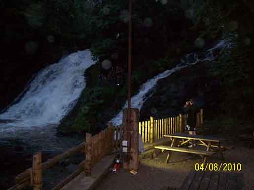 Comme pour venir confirmer ce que nous avancions et éclairer le sujet, notre attention fut attirée par un dispositif placé sur l'autre rive : un projecteur bleuté, pas très puissant mais suffisant que pour donner une ambiance assez féerique à la cascade. Alors, revoyons un peu le tableau : flash intermittent, sources lumineuses diverses (réverbères, projecteur, reliquat de lumière naturelle, etc.), éléments en mouvement (personnes présentes, l'eau de la cascade, particules éventuelles très probables. Il semble évident qu'il y ait phénomène de diffraction et de réverbération... Mais si c'était pour en arriver à une telle conclusion, ce n'était pas la peine de faire tout ce détour. On le savait depuis belle lurette !