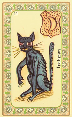 Et bien entendu dans l'occultisme (ne pas confondre avec le satanisme !). Dans l'interprétation des rêves le chat représente l'irrationnel, la solitude, l'indifférence, l'agressivité et même parfois une relation passionnelle qui peut devenir dangereuse. Le chat se retrouve également dans l'art divinatoire. Onzième lame de l'Oracle de Belline, il incarne la « Trahison ». Représenté sous les traits d'un animal en colère, couleur nuit, et doté de treize griffes acérées, il est porteur de mauvaises surprises, d'échecs, de séparations et de calomnies. Régit par la lune, cette lame évoque également l'instabilité, le changement et la fécondité.