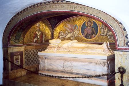 Constantin fils ou 1er est né en 286 et mort en 337. Ce jeune homme qui est devenu empereur à la mort de son père combat une bonne partie de sa vie afin d’éliminer ses compétiteurs. Plusieurs de ses batailles sont reliées à des considérations religieuses. Bien que n’étant pas chrétien lui-même au départ, sa mère, une chrétienne avouée, l’incite fortement à se faire baptiser, ce qu’il fera avant de rendre un dernier soupir. Précédemment à ce baptême tardif, Constantin, en bon politicien et voyant la religion chrétienne prendre de plus en plus de place, décide d’abolir les persécutions. De plus, avec l’édit de Milan de 313, Constantin se rallie à la faveur des chrétiens, ce qui est politiquement ingénieux, les chrétiens prédominant dans l’empire. Dans un autre ordre d’idées, Constantin fait aussi en sorte de réunifier tout l’empire pour ensuite fonder Constantinople (324-330) sur la ville de Byzance, au détroit de Bosphore. Cette ville devient rapidement la nouvelle capitale de l’empire. Fait nouveau, Constantinople est presque exclusivement sous l’égide de la chrétienté et les temples païens sont peu abondants. Mais pour en revenir à nos intérêts et plus particulièrement à Rome, Constantin fait construire sur le tombeau de Saint Pierre une basilique pour remplacer un monument déjà existant. Cette basilique est composée de cinq nefs (la partie de l’église qui s’étend du chœur jusqu’à l’entrée principale), d’un transept (la partie de l’église qui sépare de façon transversale le chœur de la nef, en forme de bras de croix) et une abside (l’extrémité en demi cercle du chœur d’une église). Le tout peut être atteint par l’ascension d’un escalier de trente-cinq marches qui mènent à l’entrée principale en atrium (en référence à la pièce principale de la maison romaine) et à une fontaine pour les absolutions. Cette basilique n’est pas encore fréquentée par le pape du temps, mais représente tout de même les premières fondations de l’actuelle Basilique Saint-Pierre. Malheureusement, elle tombe en ruine, mais elle est reconstruite en 350.