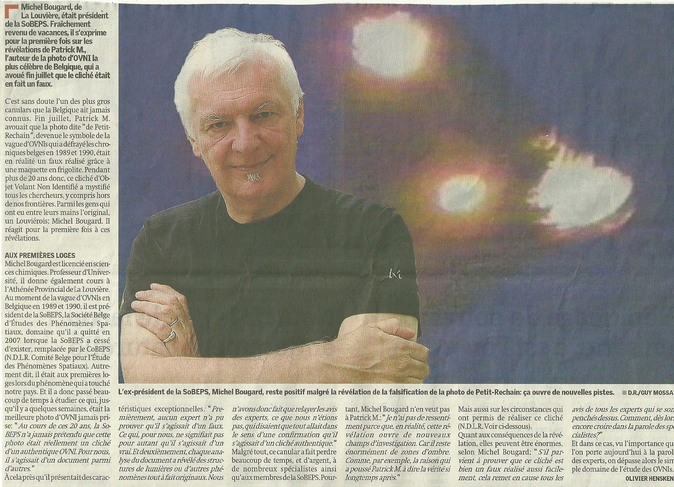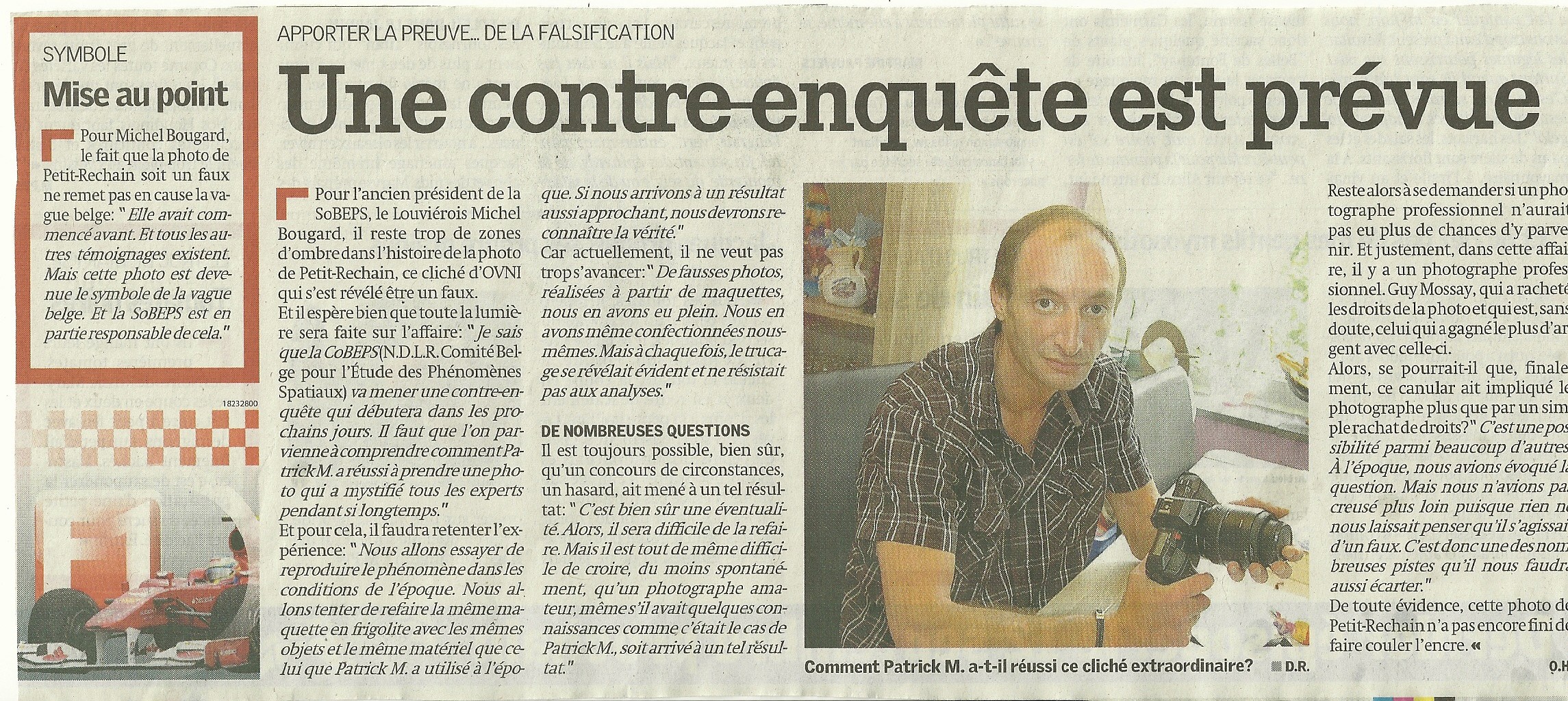 Dès l'annonce du scoop de RTL sur la supercherie de Petit-Rechain, la grosse cylindrée du CERPI s'est mise en branle, rapidement notre partenaire de "La Porte du Temps" s'associait à ses efforts et, ensemble, nous arrivions à une superbe synergie que le Groupe Sud-Presse venait couronner dans la presse papier. De longue date, nous connaissions le nom de famille de l'auteur du canular. Pouvoir le localiser avec exactitude, entrer en contact avec lui, l'interviewer, faire en sorte qu'il se confie à nous et, par là, au monde entier, apporter des éléments nouveaux et parfois fracassants, était un autre défi. Nous l'avons relevé et nous l'avons gagné !