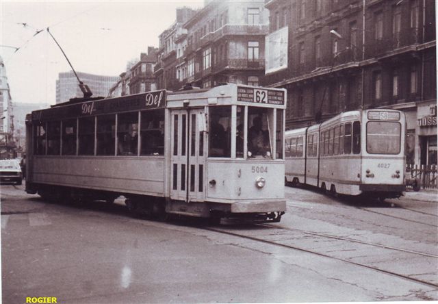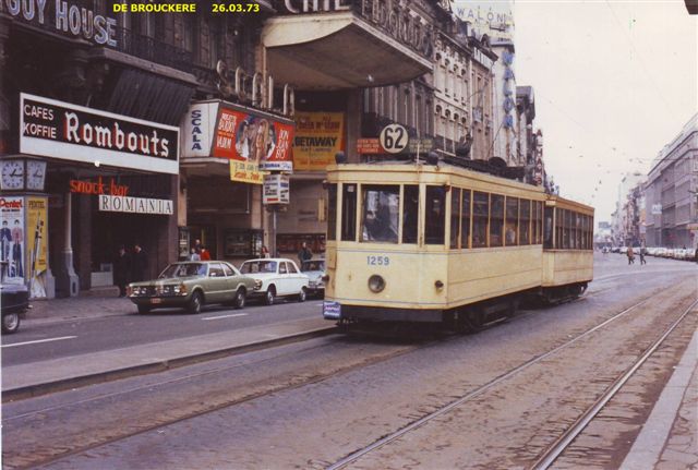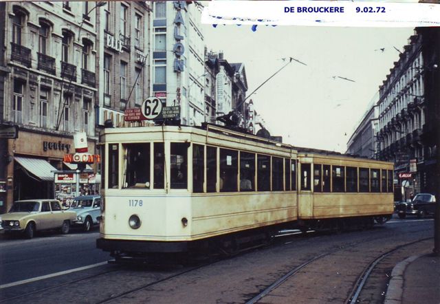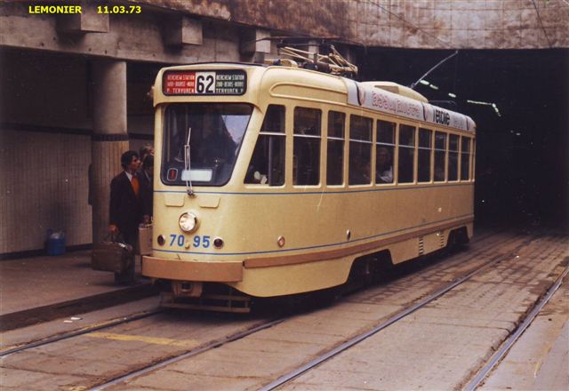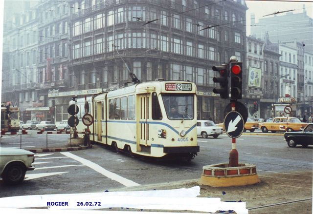 Une photo-régal en ce qui me concerne (désolé pour ceux à qui cela n'évoque strictement rien, comme je l'imagine !) En 1973, d'après la légende, un 62 sort de ce fameux tunnel Lemonnier vers le boulevard du même nom. Un détail infime, une broutille dans l'histoire des grandes restructurations et des grands travaux de Bruxelles. Mais les artisans de ces bouleversements ne pouvaient certainement pas imaginer qu'un simple gosse de même pas dix ans, doté de facultés médiumniques brouillonnes, allait découvrir le pot aux roses (ou le poteau rose ?) d'une vaste, que dis-je : une colossale entreprise parallèle, occulte. De là à endiguer le phénomène il y a une marge que je me garderai bien de franchir car nous n'en avons nullement les moyens, bien évidemment. Faire la lumière sur le problème me paraît déjà bien suffisant. Lors de mes recherches, j'ai remarqué un fait que je considère comme assez curieux bien qu'il soit historique et donc inattaquable, c'est que la STIB, entendez le Société des Transports Intercommunaux bruxellois n'a vu le jour qu'en 1954 ce qui me semble tout particulièrement tardif vu que, d'une part, je suis né en 1958 et que la présence du même type de trams me paraissait remonter à bien plus tôt dans le temps. Il est vrai que les trams existaient à Bruxelles depuis belle lurette mais ils étaient gérés par d'autres sociétés telles que "Les tramways bruxellois" ou la SNCV. Un autre point important dans les investigations réside dans le fait que nous avons déjà cité, à savoir que l'ancienne "Gare du Midi" se trouvait jadis place Rouppe, l'un des endroits qui avaient aussi toute ma vénération tramistique (il faut de temps en temps savoir inventer des mots, non ?) et que cette place, à laquelle aboutit l'avenue de Stalingrad, était copieusement fréquentée par des trams vicinaux (les motrices étaient donc d'un type différent, facilement reconnaissable et surtout : l'écartement des rails ne correspondait pas à celui des trams de la STIB ! Voilà un point important qui aura sans doute eu de nombreuses conséquences insoupçonnées !)