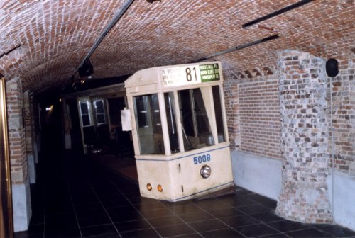 Cette fois pourtant, le périple semblait vraiment très long et les travaux rencontrés dans les couloirs de déviation mis à la disposition des clients du parking pour éviter d'autres travaux m'avaient obligé à bifurquer dans un embranchement qui donnait sur un couloir qui... bref : c'était compliqué et cela se présentait comme un véritable labyrinthe ! Quelques passages plus loin, surprise ! Mais alors là, vraiment, il s'agissait d'une surprise colossale, principalement pour un amateur de vieux trams comme moi ! Je me trouvais quasiment nez à nez avec un tram de la ligne 81, privé de rails et d'ailleurs également de roues et d'essieux, comme affalé sous une voûte de briques où ne régnait qu'une faible lueur blafarde. La rame était manifestement incomplète et sa présence complètement incongrue en ces lieux : aucune utilité, aucune raison, aucune explication non plus d'ailleurs ! Des pas résonnent dans un couloir voisin, une lueur apparaît, semble hésiter, puis s'éteint et le silence revient. Où donc suis-je tombé ? Qu'est-ce que cette mascarade ? Mon esprit
