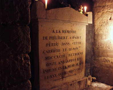 suivante "A la mémoire de Philibert Aspairt perdu dans cette carrière le 3 novembre 1793, retrouvé 11 ans après et inhumé en la même place le 30 avril 1804.