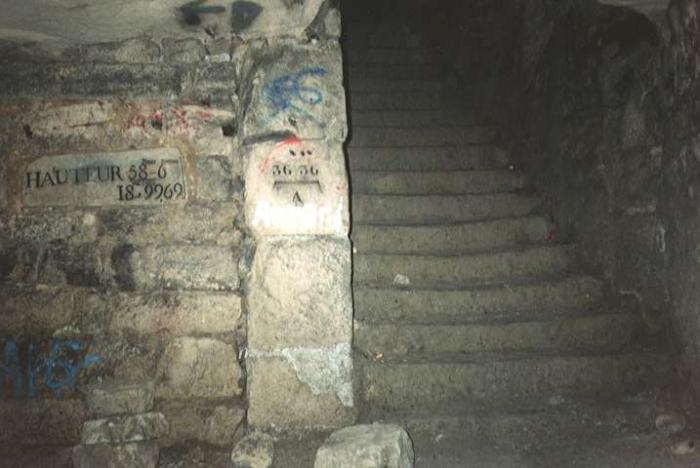On peut ainsi trouver des plaques, parfois émaillées (bien que de plus en plus difficiles à trouver en raison du vol systématique de la part de collectionneurs, portant des dates, la situation des édifices de surface en l'aplomb (par exemple : " sous l'église ", " le bassin, les jardins "...), des indications de nivellement. Malgré l'anachronisme et les disparitions, ces plaques et autres inscriptions confèrent aux lieux une impression très spéciale, celle de se déplacer sur deux plans à la fois, le plan souterrain et son équivalent en surface.