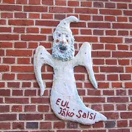 Toujours dans le domaine du béton, vous trouverez aussi une sorcière bleue (?) et à l'oeil rouge qui vous indique la direction à suivre tout en rappelant l'incantation magique. Vous ne manquerez pas "El Mahomeu" (le Mahomet) qui est en fait aussi un épouvantail très spécial. Parfois aussi, vous passerez par des endroits où vous ne trouverez... rien ! C'est qu'il y avait jadis là des têtes de bonshommes en béton, à proximité d'un ruisseau, mais que des vandales les ont saccagés, en ont jeté les poteaux dans le ruisseau, laissant là aussi la trace indélébile d'un des laids débiles qui hantent notre société. On ne refera plus le monde, hélas!