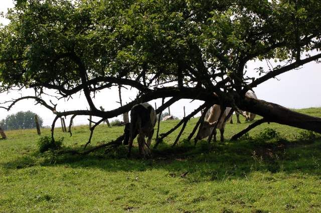 Nous en prenons pour témoin cet arbre couché à l'ombre duquel viennent se reposer quelques ruminants paisibles. Faut-il le dire aussi cette même nature encaissée et vallonnée à souhait peut présenter un spectacle vraiment hallucinant en cas de déchaînement des éléments. Les orages y sont particulièrement costauds et les tempêtes (de plus en plus fréquentes comme partout en Belgique) contribuent à leur manière à l'ambiance de surnaturel de la région. |