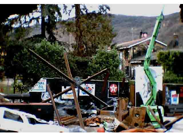 la propriété à l'aide d'une grue). Dans la cour, des carcasses de voitures et d'avion offrent aux passants un paysage désolé. Enfin, murs et toitures portent les