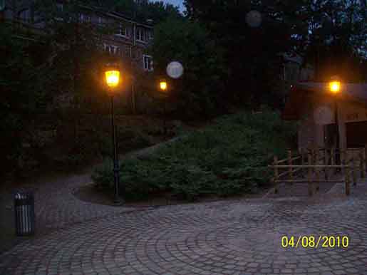 Comme pour venir confirmer ce que nous avancions et éclairer le sujet, notre attention fut attirée par un dispositif placé sur l'autre rive : un projecteur bleuté, pas très puissant mais suffisant que pour donner une ambiance assez féerique à la cascade. Alors, revoyons un peu le tableau : flash intermittent, sources lumineuses diverses (réverbères, projecteur, reliquat de lumière naturelle, etc.), éléments en mouvement (personnes présentes, l'eau de la cascade, particules éventuelles très probables. Il semble évident qu'il y ait phénomène de diffraction et de réverbération... Mais si c'était pour en arriver à une telle conclusion, ce n'était pas la peine de faire tout ce détour. On le savait depuis belle lurette !