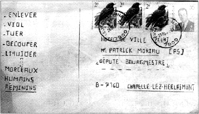 Mercredi, le 20 août 1997 Patrick Moriau, un membre de la commission parlementaire dans l'affaire Dutroux, a révélé qu'il avait reçu 3 cartes postales anonymes avec des messages codés du meurtrier présumé. Ils ont été postés autour du 26 mai 1997 à Leuze-en-Hainaut. Le journal "La Nouvelle Gazette" a aussi reçu des messages semblables. Moriau a créé un peu d'agitation dans l'affaire Dutroux en publiant un livre montrant le témoignage des gens impliqués dans ce cas et qui ont fait leurs déclarations derrière des portes fermées. Jeudi, le 21 août 1997 une nouvelle victime possible est ajoutée à la liste, il s'agit de Bégonia Valencia, 38 ans, qui avait disparu à Frameries vers la mi-juillet. Elle était dans un état diminué et a fréquenté le secteur de la gare de Mons. Un autre rapport avec les victimes précédentes est qu'elle a été traitée dans un établissement psychiatrique, le Chêne-aux-Haies, là où Martine Bohn a aussi été traitée. Les enquêtes ont prouvé qu'elle n'a pas rentré ses 2 derniers contrôles de chômage et n'a pas retiré d'argent de son compte bancaire depuis le 20 juin.