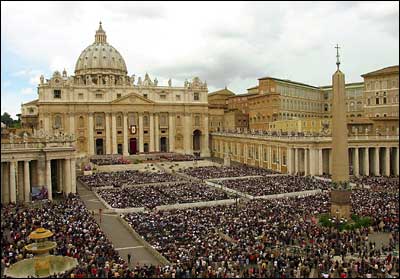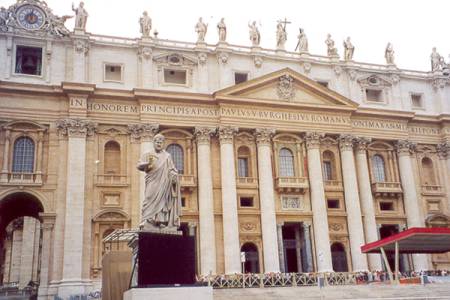 Porte d’entrée de l’État du Vatican, la place Saint Pierre semble l’allongement physique de la Basilique, tout au moins à lui servir de cours extérieure. Plusieurs monuments et détails font de ce carrefour un endroit magnifique, gigantesque mais tout autant intéressant. Premièrement, en son centre se dresse l’obélisque, un monolithe de granit de plus de 300 tonnes qui fait près de 26 mètres de haut. Initialement construit au Ier siècle à Héliopolis, il symbolise l’autorité romaine sur sa province d’alors, l’Égypte. En 37, on le transporte à Rome, à l’intérieur du cirque du Vatican, et il y reste jusqu’en 1586. Le pape Sixte Quint décide à cette époque de le transférer à l’endroit de ce qui deviendra la place Saint Pierre, et le déménagement dure quatre mois. Au sommet de l’obélisque, il est possible d’y apercevoir une réplique de la croix sur laquelle Jésus fut crucifié. Sur le pavement de la place se trouvent plusieurs lignes qui représentent en fait le plan qui servit à construire la colonnade, soit la série de colonnes qui forment les murs entourant la place. De chaque côté de l’obélisque sont érigées deux grandes fontaines, celle de gauche étant l’œuvre du Bernin, l’autre de Maderno. À 14 mètres de hauteur, les jets de ces fontaines évacuent pour plus de 2.3 millions de litres d’eau à l’heure. Détail intéressant, il y a entre l’obélisque et chacune des fontaines un disque de porphyre rouge incrusté dans le pavement. Ces disques indiquent les foyers de l’ellipse que forment les colonnes, et à ces endroits, la colonnade semble n’être constituée que d’une rangée de colonnes (alors qu’il y a en quatre), illusion voulue par le Bernin. En parlant de ces colonnes, elles sont au nombre de 296 et chaque extrémité de la colonnade se compose de piliers, 48 en tout. La colonnade se dresse à plus de 19 mètres et on retrouve à son sommet une lignée de 140 statues grandes de plus de trois mètres, produites par les élèves du Bernin.