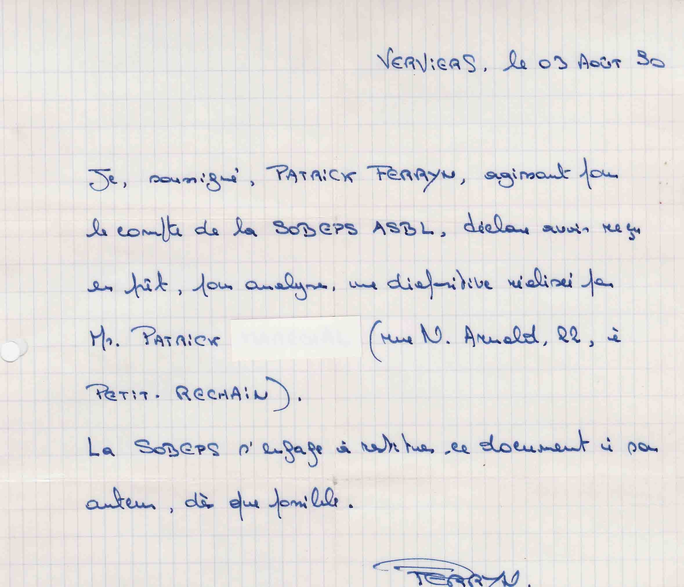 s'engageaient à me la restituer dès que possible. Mais je ne l'ai plus jamais revue. Par contre, la SOBEPS m'a remis des doubles, mais jamais l'original.
